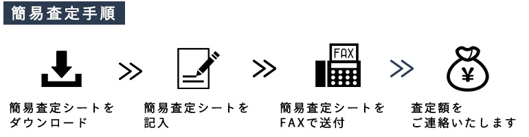 おおよその買取価格をお調べします。下記の通り、簡易査定シートをダウンロードいただき、必要事項をご記入しFAXでご送付お願いいたします。